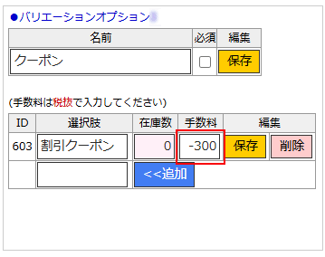 手数料にはマイナスの金額を設定することができます選択肢にスペースを使用するとMacで動作しない場合がありますのでご注意ください。